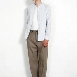 ANTE is a classic collarless shirt with a regular fit. It comes in a solid white and a yarn dyed light blue/grey version. The blue version has details like a contrast white fabric inside the collar and inside the cuffs. Both have been garment washed to ensure the casual look and softer hand feel