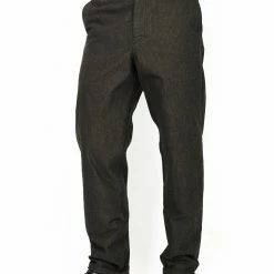 The fabric comes from Italy and it has a herringbone weave. It is woven with black and white yarns, which create a vivid structure when the garment is dyed. The surface is brushed and the yarn composition is 98% cotton and 2% elastane.