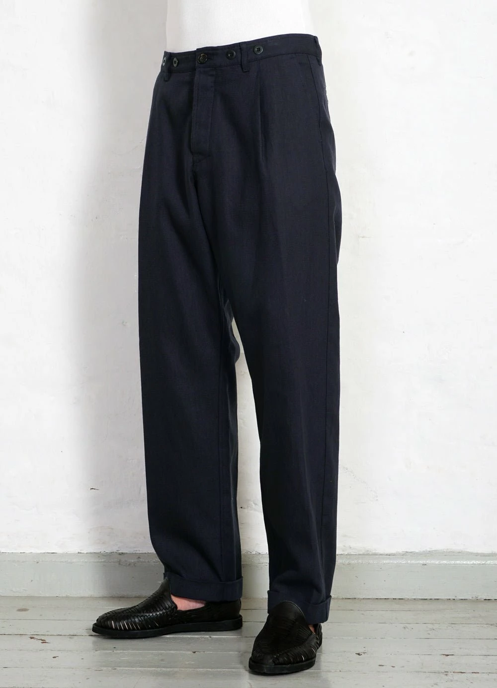 SUNE is loosely fitted trouser with wide cut legs, pleats, suspender buttons, folded cuffs and a rubber grip waistband.