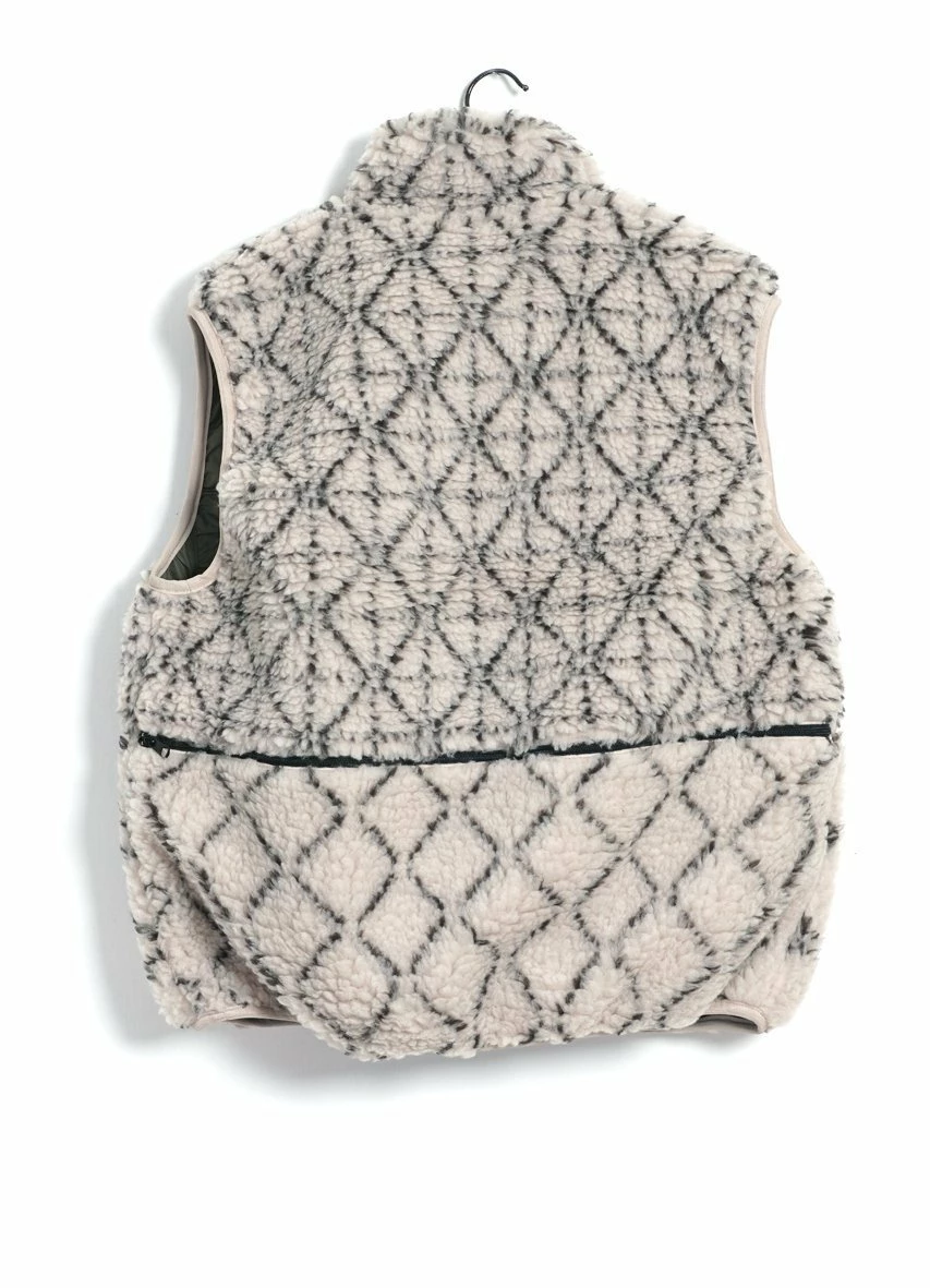 Reversible, allover print fleece vest. As the name suggests, the allover print gets its name and takes inspiration from the traditional Japanese embroidery technique, Sashiko.
