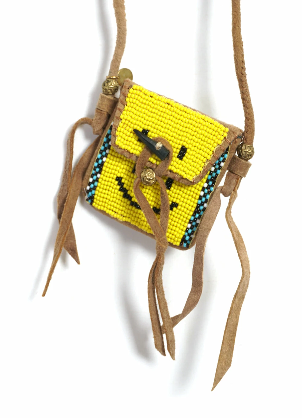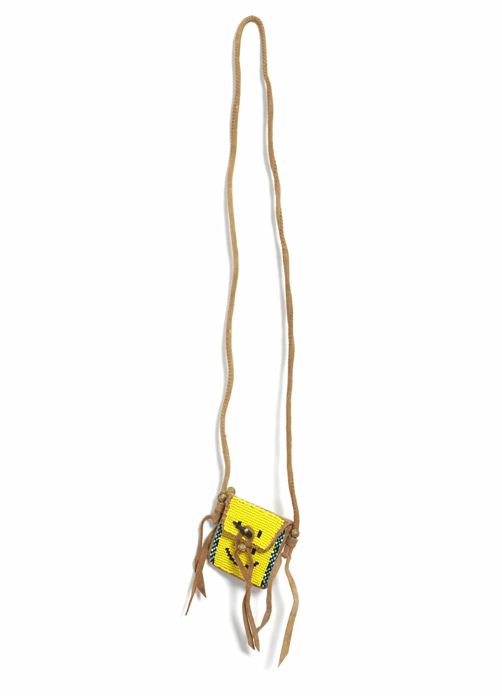 A charm necklace with the ‘RAIN SMILEY’, made of deer leather and glass beads. The charm part can be opened and used as a small pouch.