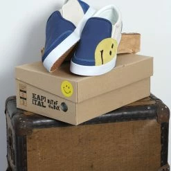 Simple slip-on shoe in a premium thick cotton canvas with suede mudguard, heel and Kapital Rain Smile detail. Leather lined.